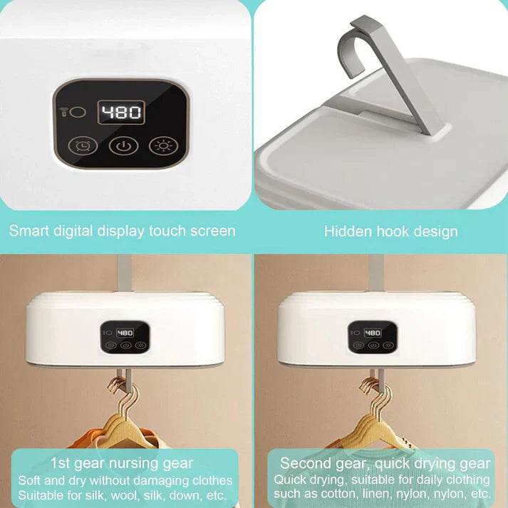 - Fast and Efficient Drying portable clothes dryer quickly dries up to 9 clothes in just 20 minutes. Its advanced technology efficiently removes moisture using heat and airflow, eliminating the need for air-drying or hanging.